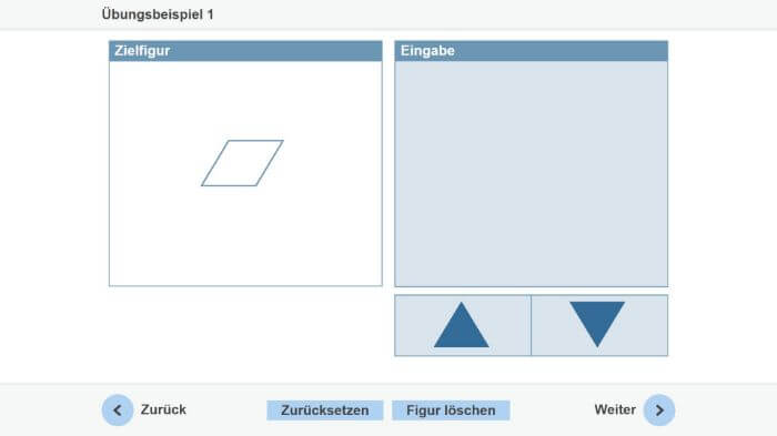 In einem Feld ist der Umriss einer Zielfigur dargestellt, welche aus mehreren gleichseitigen Dreiecken besteht. Die Person baut in einem weiteren Feld die Zielfigur innerhalb von 60 Sekunden nach. Dazu stehen ihr nach oben und nach unten gerichtete, gleichseitige Dreiecke zur Verfügung.